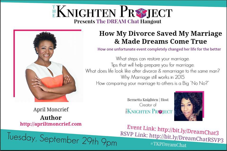 Okay everybody, Get Geady! I’m teaming up with The Knighten Project, and we’ll be discussing my latest book, “How My Divorce Saved My Marriage”. The Knighten Project is an amazing organization that focuses on inspiring Hope in everyday people by helping to facilitate their biggest dreams! So on Tuesday, September 29, 2015 @ 9pm, you’re invited to the Dream Chat hangout to hangout with myself and the founder of The Knighten Project, Bernetta Jackson-Knighten! We’ll be discussing the struggles and strategies I used in my marriage to turn it into, not only a dream marriage, but now a dream career for me! Hope to see/hear you there! By the way, the link to sign up/register for the Dream Chat is right here!